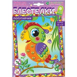 Разноцветный попугайчик красуется и поёт среди экзотических цветов в пышных кронах южных деревьев. Мини-картины серии 'Блестелки' - первые шаги ребёнка старше 5 лет в освоении интересной и красочной техники мозаики. Это самый простой пример мозаики - не сплошное составление картины из мелких элементов, а декорирование её отдельных частей. Украсьте картину разноцветными искрящимися пайетками! Без клея - аккуратно и чисто!