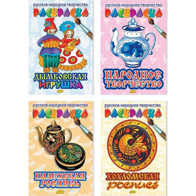 В набор входят следующие раскраски: 1. Дымковская игрушка 2. Народное творчество 3. Палехская роспись 4. Хохломская роспись.